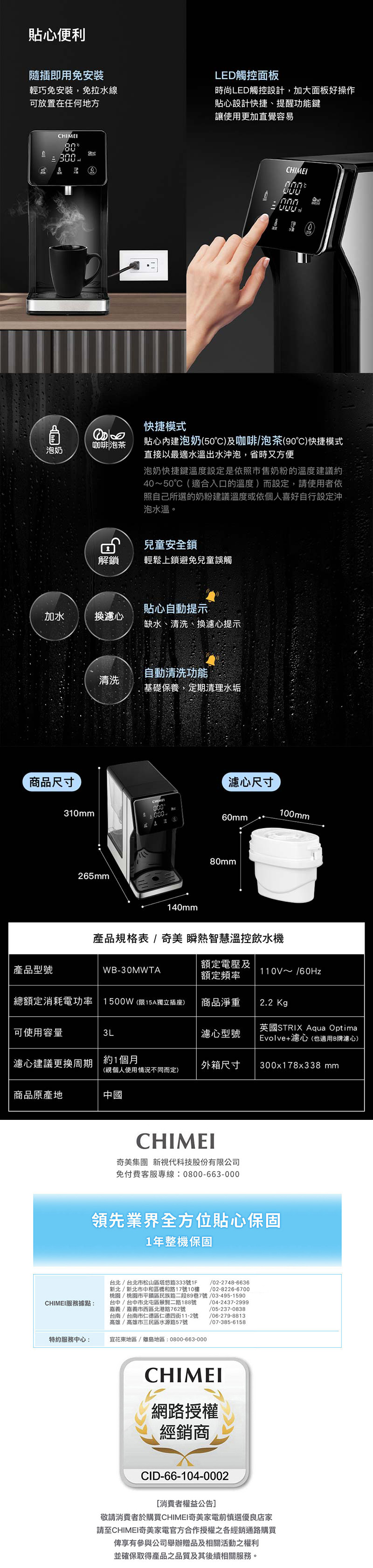 CHIMEI奇美 3L瞬熱智慧溫控飲水機(附英國濾心) WB-30MWTA