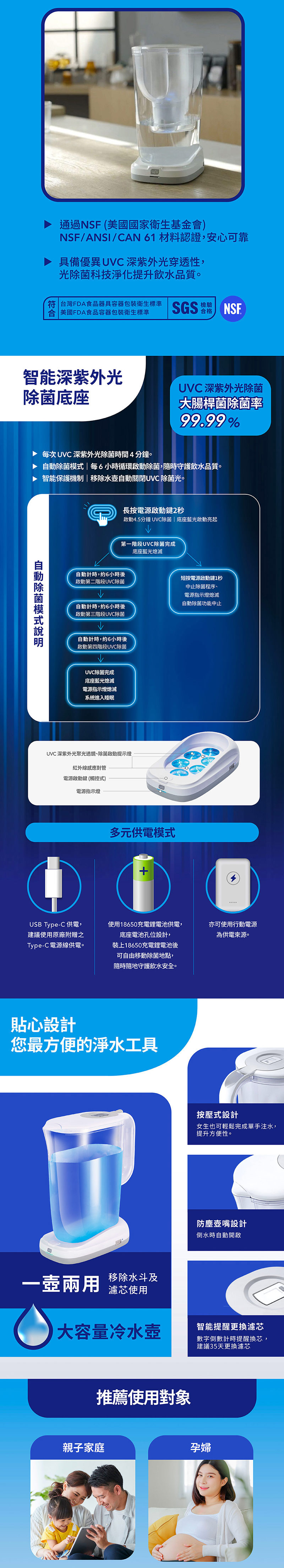 ◆使用自來水/飲水機入水,第一道四重濾心過濾,第二道UVC除菌,滴滴純淨始終如一。