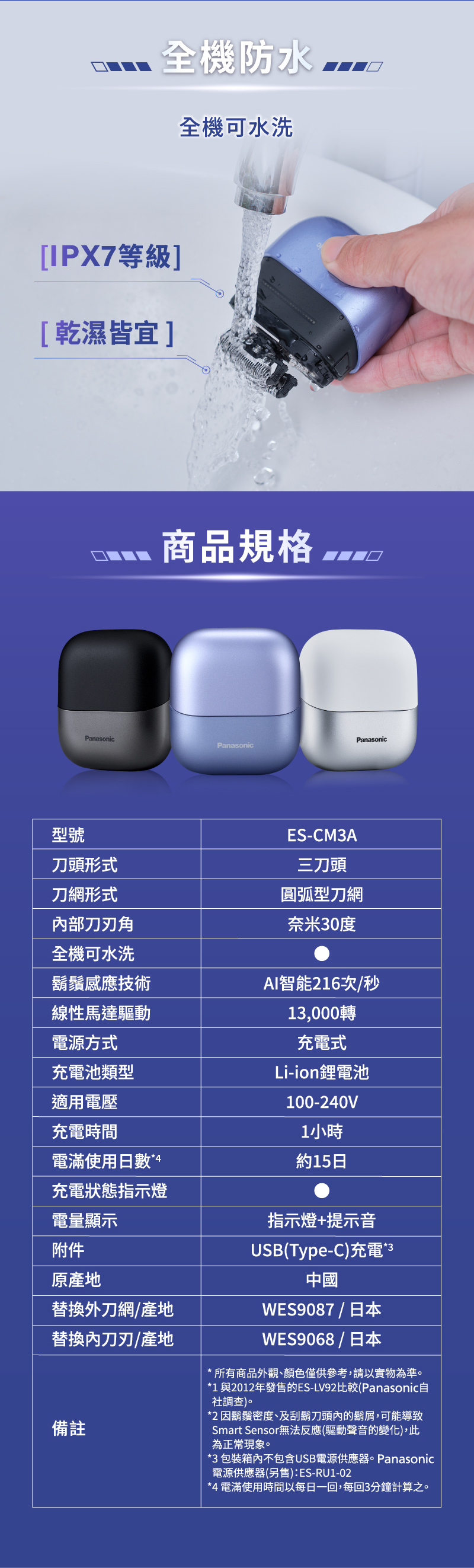 Panasonic 掌上型三枚刃觸控電鬍刀 小精靈 ES-CM3A-V(炫光紫)