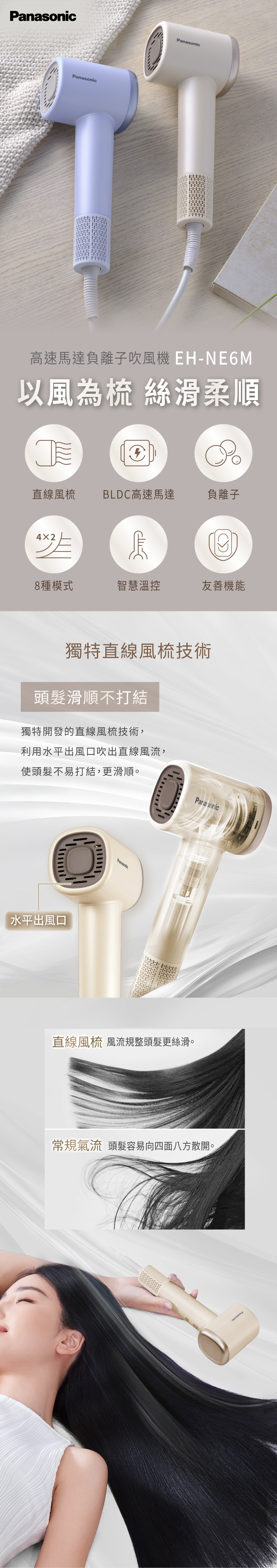 ◆Panasonic獨特直線風梳技術,利用水平出風口吹出直線風梳氣流,使頭髮不易打結,更滑順。