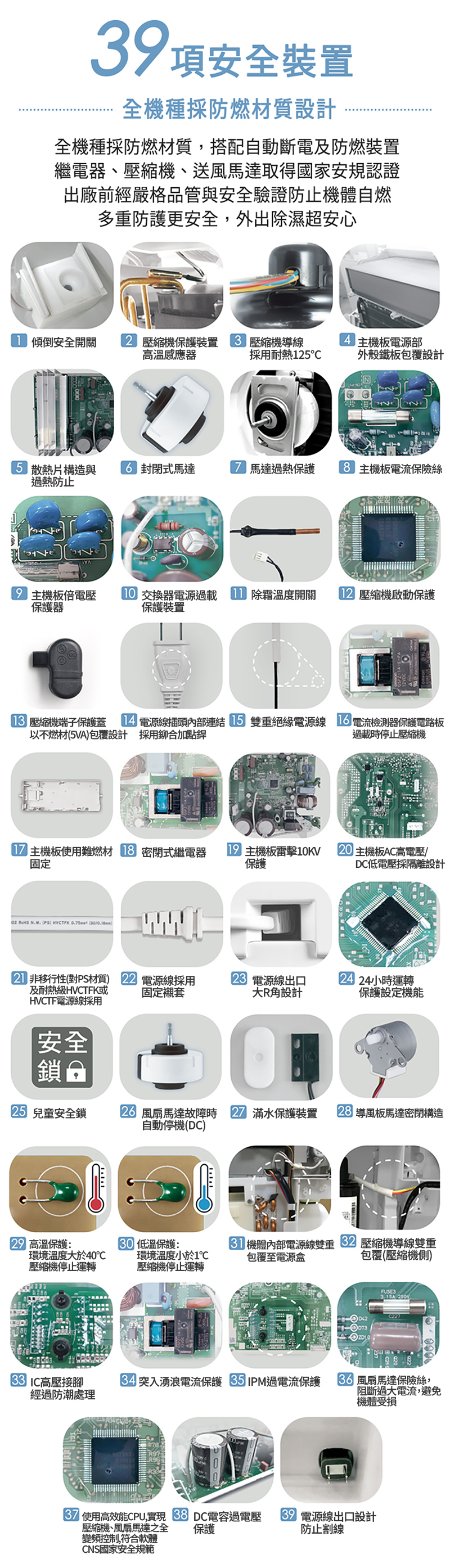 ◆39項安全裝置,全機種採防燃材質,搭配自動斷電及防燃裝置,繼電器、壓縮機、送風馬達取得國家安規認證,出廠前經嚴格品管與安全驗證防止機體自燃,多重防護更安全,外出除濕超安心。