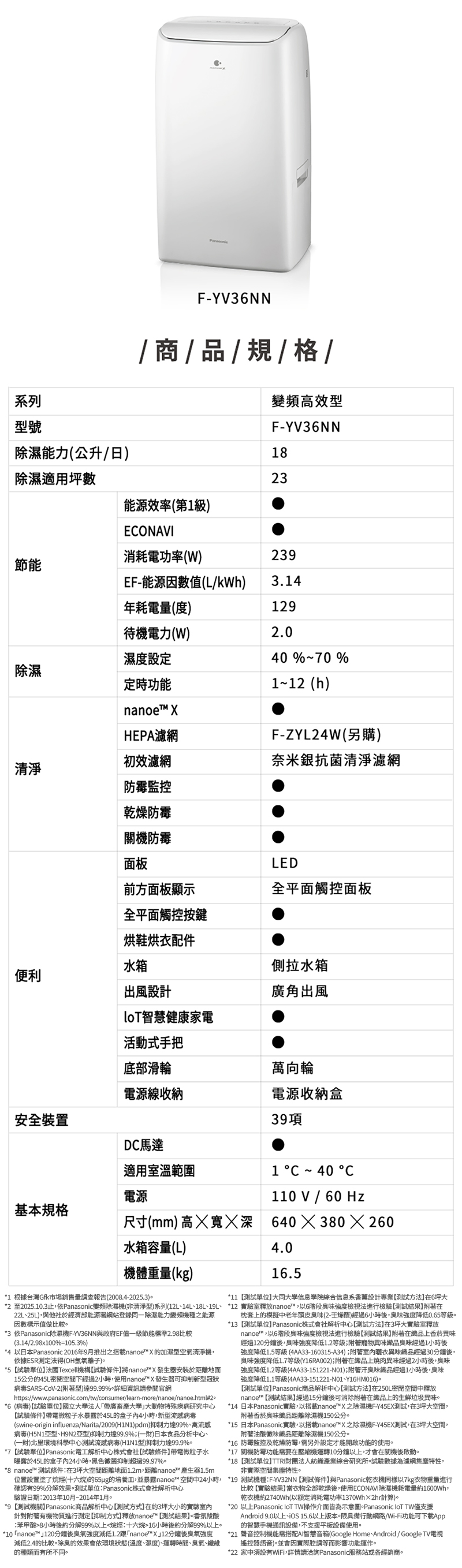 Panasonic 18L變頻高效除濕機 F-YV36NN
