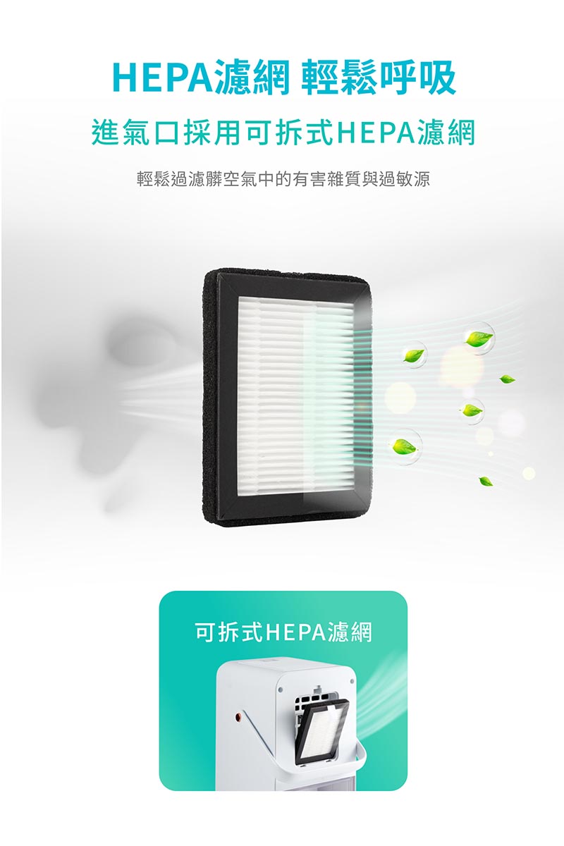 - 進氣口採用可拆式HEPA濾網,輕鬆過濾有害雜質與過敏源