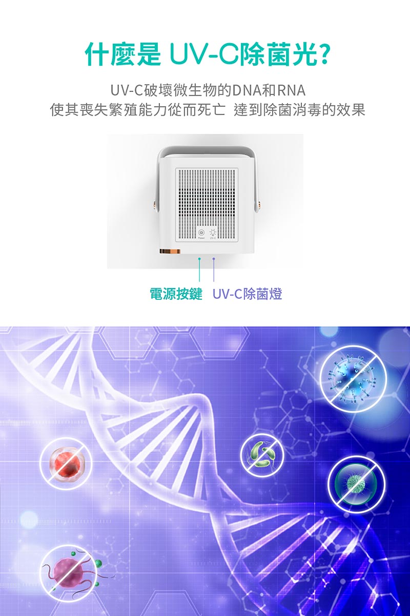 - UV-C除菌光,能穿透、抑制病菌生長繁殖