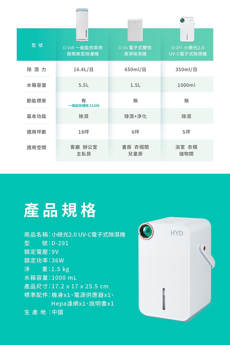 HYD 小綠光2.0 UV-C電子式除濕機D-291