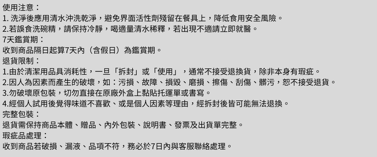 (一)本產品無添加有害物質及環境荷爾蒙安心又安全,經第3 公正單位檢驗無重金屬、無砷、無螢光劑增白劑、無三氯沙、無著色劑、無壬基苯酚及無甲醇。
