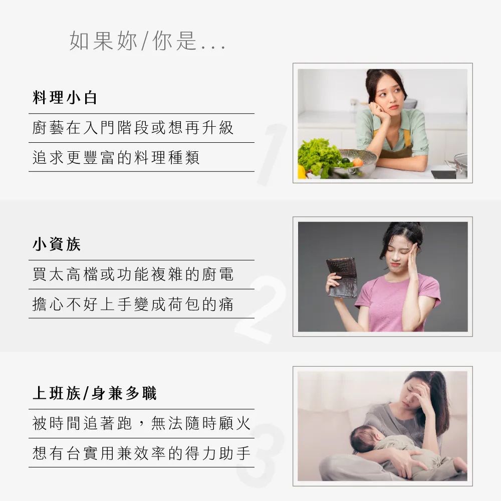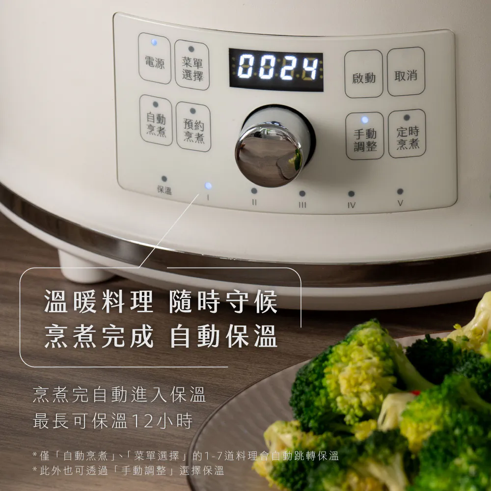 - 內建8種自選菜單,一鍵式烹煮,便利不繁鎖