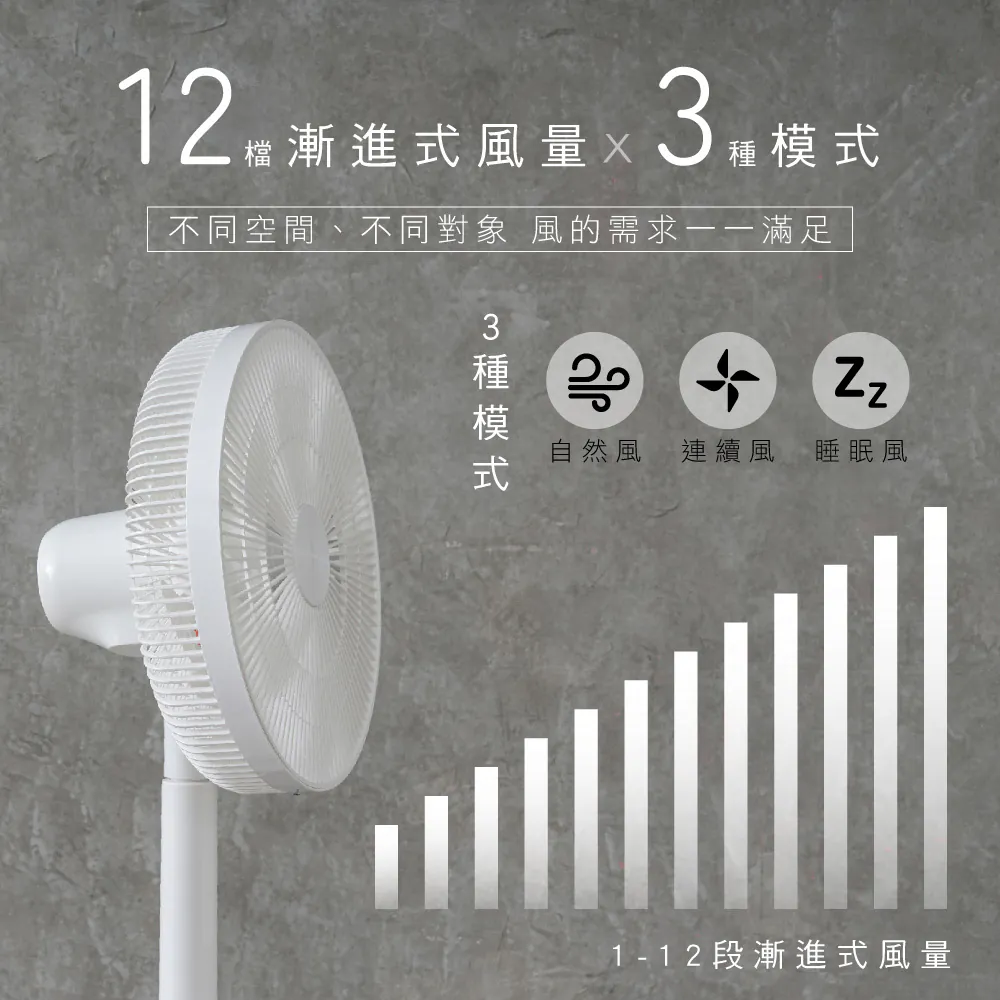 - 12檔漸進式風量,微風、勁風強度自由調節