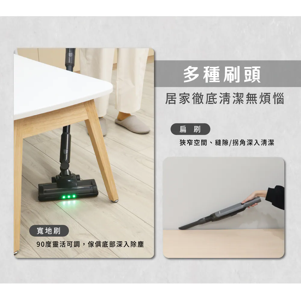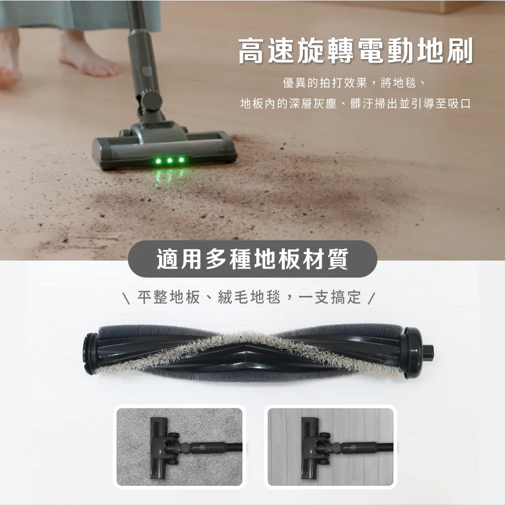 - 電動地刷帶動刷毛深入縫隙,拍打、掃吸同步進行