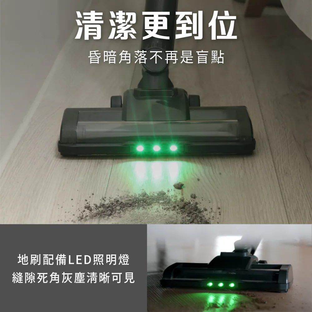 - 地刷頭LED綠光照明,縫隙、陰影灰塵無所遁形