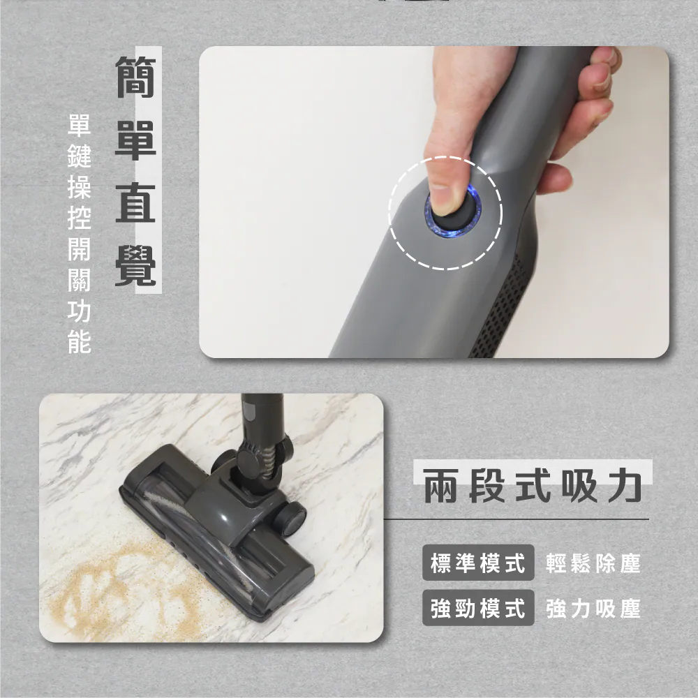 - 一鍵切換兩種吸塵模式,標準清潔、強力清潔