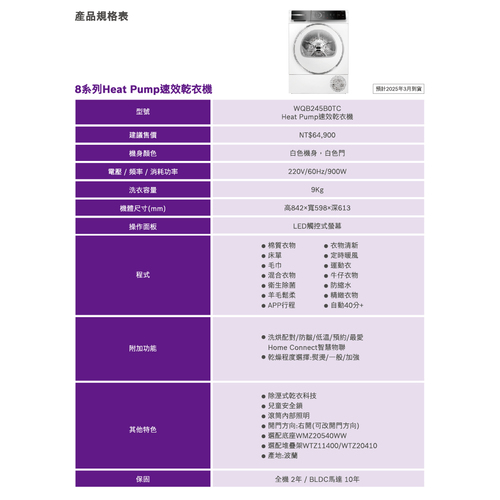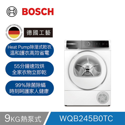 BOSCH博世9公斤220V熱泵式滾筒乾衣機WQB245B0TC附收納增高底座_含基本安裝